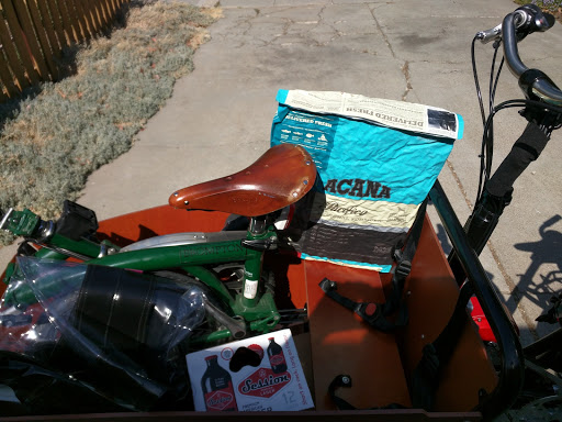 I picked it up in Santa Clara and got some strange looks on Trimble on my way to the Guadalupe Trail. I immediately used it to haul some dog food and beer: