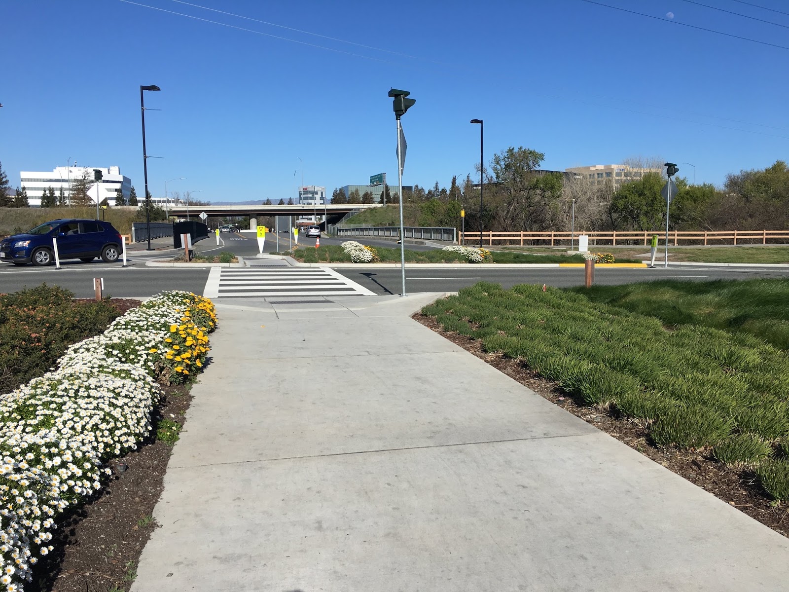 Here’s a photo mid-crossing (in the tiny parking lot) looking toward 87/Airport Parkway and showing the trail access point. Guadalupe river trail access is across the crosswalk and to the left.