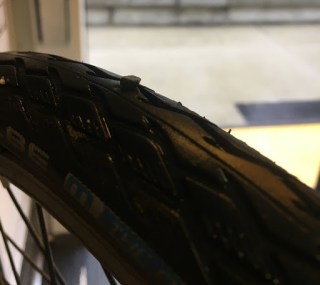 I caught that little bit in my front tire when I was riding over to Tamien Caltrain Station. On some days I pad my commute time a little but not that day–I was timing things to roll right into the station. Especially since I was running late due to the dreaded DST clock change.