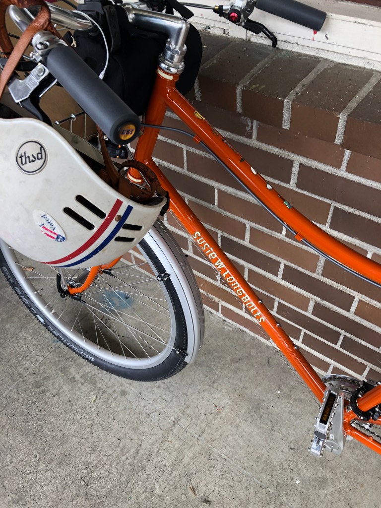I did a couple very short shakedown runs but today was my first ride out on the road, so of course I had to get coffee. The basket cried out for donuts so I set course for the local bakery (Castle Rock Bake Shop and Espresso) where I bought a half dozen donuts and a (decaf) espresso. A hilly but manageable 9 miles, all by bike today!